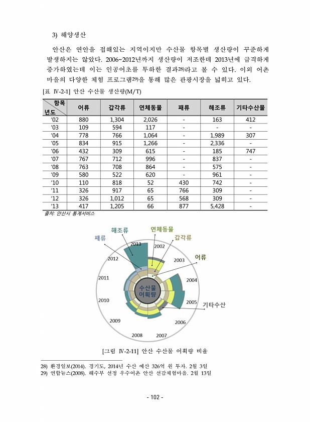3 해양생산 안산은 연안을 접해있는 지역이지만 수산물 항목별 생산량이 꾸준하게 발생하지는 않았다. 20062012년까지 생산량이 저조한데 2013년에 급격하게 증가하였는데 이는 인공어초를 투하한 결과28 라고 볼 수 있다. 이외 어촌 마을의 다양한 체험 프로그램29 을 통해 많은 관광시장을 넓히고 있다. 항목 년도 어류 갑각류 연체동물 패류 해조류 기타수산물 ‘02 880 1,304 2,026 163 412 ‘03 109 594 117 ‘04 778 766 1,064 1,989 307 ‘05 834 915 1,266 2,336 ‘06 432 309 615 185 747 ‘07 767 712 996 837 ‘08 763 708 864 575 ‘09 580 522 620 961 ‘10 110 818 52 430...