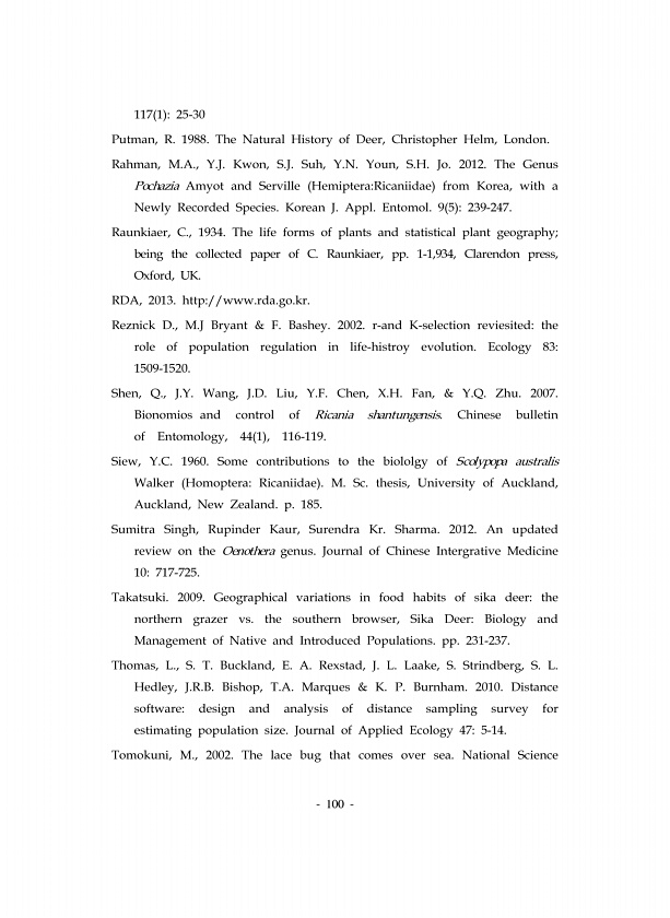 100 117 1 25-30 Putman, R. 1988. The Natural History of Deer, Christopher Helm, London. Rahman, M.A., Y.J. Kwon, S.J. Suh, Y.N. Youn, S.H. Jo. 2012. The Genus Pochazia Amyot and Serville HemipteraRicaniidae from Korea, with a Newly Recorded Species. Korean J. Appl. Entomol. 9 5 239-247. Raunkiaer, C., 1934. The life forms of plants and statistical plant geography; being the collected paper of C. R...