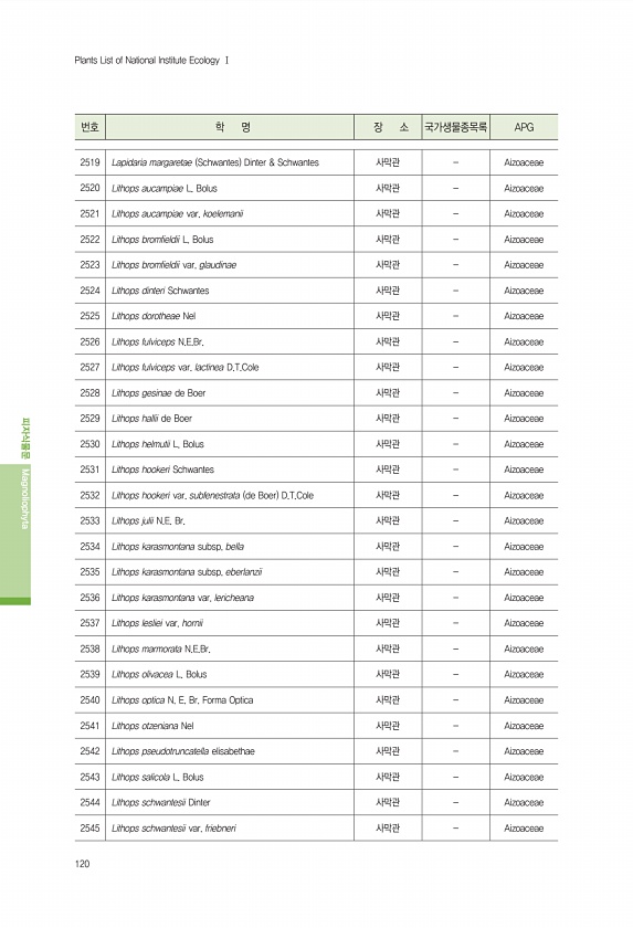 120 번호 학 명 장 소 국가생물종목록 APG 피자식물문 Magnoliophyta Plants List of National Institute Ecology Ⅰ 2519 Lapidaria margaretae Schwantes Dinter & Schwantes 사막관 Aizoaceae 2520 Lithops aucampiae L. Bolus 사막관 Aizoaceae 2521 Lithops aucampiae var. koelemanii 사막관 Aizoaceae 2522 Lithops bromfieldii L. Bolus 사막관 Aizoaceae 2523 Lithops bromfieldii var. glaudinae 사막관 Aizoaceae 2524 Lithops dinteri Schwantes 사막관 Aizo...