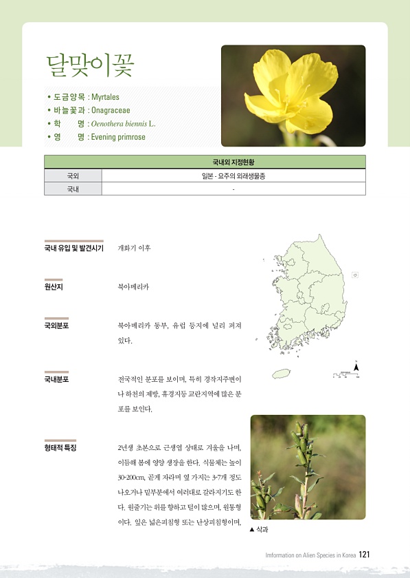 포유류 양서류 · 파충류 담수어류 곤충류 연체동물 외래식물 Imformation on Alien Species in Korea 121 국내 유입 및 발견시기 개화기 이후 원산지 북아메리카 국외분포 북아메리카 동부, 유럽 등지에 널리 퍼져 있다. 국내분포 전국적인 분포를 보이며, 특히 경작지주변이 나 하천의 제방, 휴경지등 교란지역에 많은 분 포를 보인다. 형태적 특징 2년생 초본으로 근생엽 상태로 겨울을 나며, 이듬해 봄에 영양 생장을 한다. 식물체는 높이 30-200cm, 곧게 자라며 옆 가지는 3-7개 정도 나오거나 밑부분에서 여러대로 갈라지기도 한 다. 원줄기는 위를 향하고 털이 많으며, 원통형 이다. 잎은 넓은피침형 또는 난상피침형이며, ? 도 금 양 목 Myrtales ? 바 늘 꽃 과 Onagra...