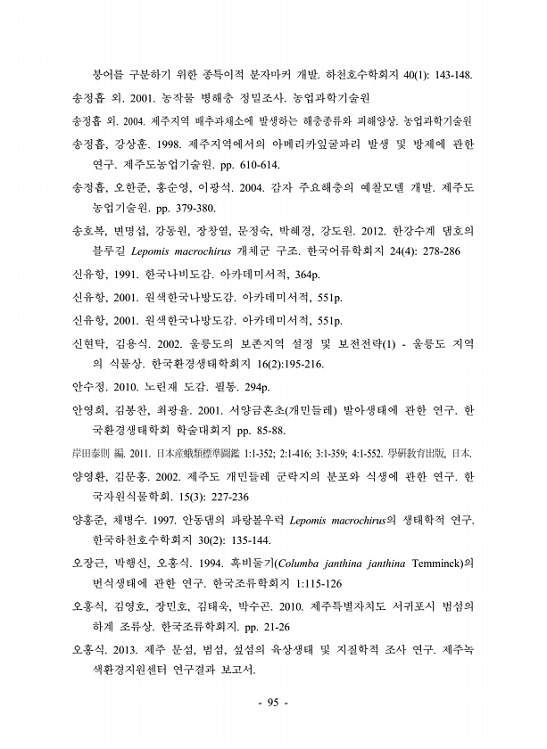 95 붕어를 구분하기 위한 종특이적 분자마커 개발. 하천호수학회지 40 1 143-148. 송정흡 외. 2001. 농작물 병해충 정밀조사. 농업과학기술원 송정흡 외. 2004. 제주지역 배추과채소에 발생하는 해충종류와 피해양상. 농업과학기술원 송정흡, 강상훈. 1998. 제주지역에서의 아메리카잎굴파리 발생 및 방제에 관한 연구. 제주도농업기술원. pp. 610-614. 송정흡, 오한준, 홍순영, 이광석. 2004. 감자 주요해충의 예찰모델 개발. 제주도 농업기술원. pp. 379-380. 송호복, 변명섭, 강동원, 장창열, 문정숙, 박혜경, 강도원. 2012. 한강수계 댐호의 블루길 Lepomis macrochirus 개체군 구조. 한국어류학회지 24 4 278-286 신유항, 1991. 한국나비도감. 아카...