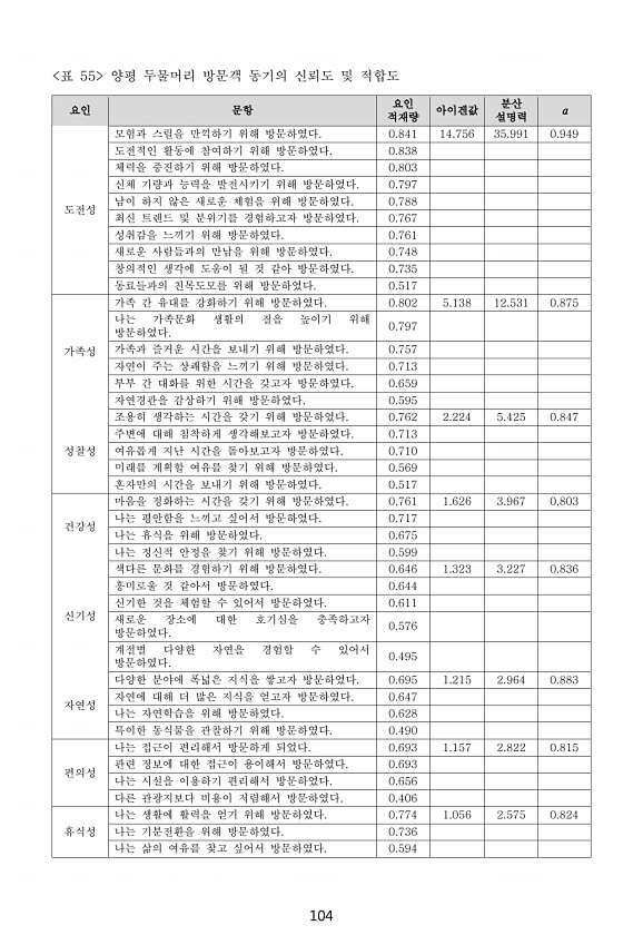 104 표 55 양평 두물머리 방문객 동기의 신뢰도 및 적합도 요인 문항 요인 적재량 아이겐값 설명력 분산 α 도전성 모험과 스릴을 만끽하기 위해 방문하였다. 0.841 14.756 35.991 0.949 도전적인 활동에 참여하기 위해 방문하였다. 0.838 체력을 증진하기 위해 방문하였다. 0.803 신체 기량과 능력을 발전시키기 위해 방문하였다. 0.797 남이 하지 않은 새로운 체험을 위해 방문하였다. 0.788 최신 트렌드 및 분위기를 경험하고자 방문하였다. 0.767 성취감을 느끼기 위해 방문하였다. 0.761 새로운 사람들과의 만남을 위해 방문하였다. 0.748 창의적인 생각에 도움이 될 것 같아 방문하였다. 0.735 동료들과의 친목도모를 위해 방문하였다. 0.517 가족성 가족 간 유대를 강화...