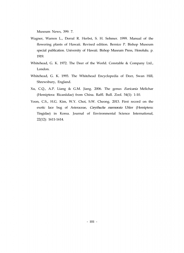 101 Museum News, 3997. Wagner, Warren L., Derral R. Herbst, S. H. Sohmer. 1999. Manual of the flowering plants of Hawaii. Revised edition. Bernice P. Bishop Museum special publication. University of Hawaii. Bishop Museum Press, Honolulu. p. 1919. Whitehead, G. K. 1972. The Deer of the World. Constable & Company Ltd., London. Whitehead, G. K. 1993. The Whitehead Encyclopedia of Deer, Swan Hill, Shr...
