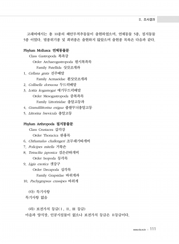 Ⅱ. 조사결과 www.nie.re.kr ? 111 고래여에서는 총 10종의 해안무척추동물이 출현하였으며, 연체동물 5종, 절지동물 5종 이었다. 멸종위기종 및 희귀종은 출현하지 않았으며 출현종 목록은 다음과 같다. Phylum Mollusca 연체동물문 Class Gastropoda 복족강 Order Archaeogastropoda 원시복족목 Family Patellida 삿갓조개과 1. Cellana grata 진주배말 Family Acmaeidae 흰삿갓조개과 2. Collisella dorsuosa 두드럭배말 3. Lottia kogamogai 애기두드럭배말 Order Mesogastropoda 중복족목 Family Littorinidae 총알고둥과 4. Granulilittorina exigua 좁쌀...