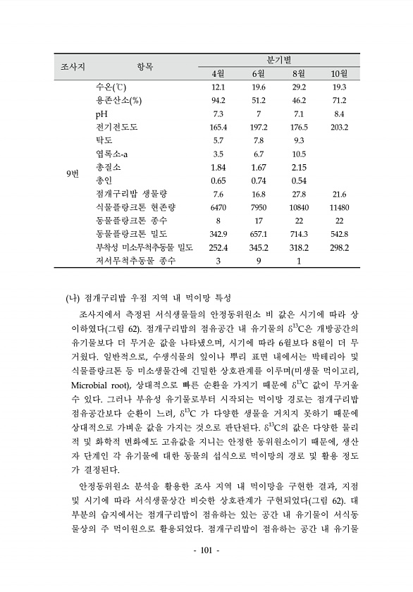101 조사지 항목 분기별 4월 6월 8월 10월 9번 수온 ℃ 12.1 19.6 29.2 19.3 용존산소 % 94.2 51.2 46.2 71.2 pH 7.3 7 7.1 8.4 전기전도도 165.4 197.2 176.5 203.2 탁도 5.7 7.8 9.3 엽록소-a 3.5 6.7 10.5 총질소 1.84 1.67 2.15 총인 0.65 0.74 0.54 점개구리밥 생물량 7.6 16.8 27.8 21.6 식물플랑크톤 현존량 6470 7950 10840 11480 동물플랑크톤 종수 8 17 22 22 동물플랑크톤 밀도 342.9 657.1 714.3 542.8 부착성 미소무척추동물 밀도 252.4 345.2 318.2 298.2 저서무척추동물 종수 3 9 1 나 점개구리밥 우점 지역 내 먹이망 특성 조사지...