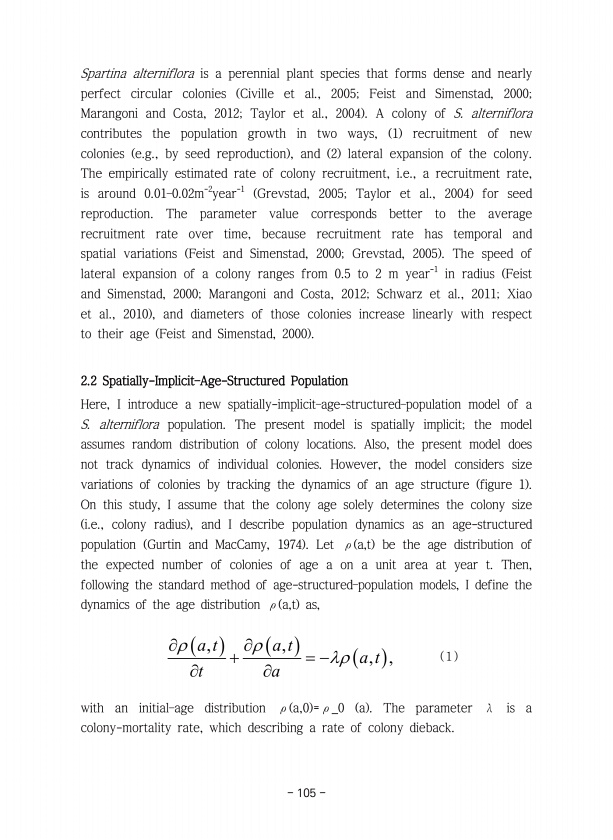 105 Spartina alterniflora is a perennial plant species that forms dense and nearly perfect circular colonies Civille et al., 2005; Feist and Simenstad, 2000; Marangoni and Costa, 2012; Taylor et al., 2004 A colony of S. alterniflora contributes the population growth in two ways, 1 recruitment of new colonies e.g., by seed reproduction , and 2 lateral expansion of the colony. The empirically estima...