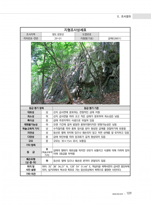 Ⅱ. 조사결과 www.nie.re.kr ? 109 지형조사상세표 조사지역 청도 운문산 도엽번호 격자번호-연번 29-01 지형명 기호 급애 GM01 등급 평가 항목 등급 평가 기준 대표성 상 산지 급사면에 분포하는 전형적인 급애 지형 희소성 하 산지 급사면을 따라 크고 작은 급애가 분포하여 희소성은 낮음 특이성 중 급애 주변지역이 식생으로 뒤덮여 있음 재현불가능성 하 오랜 기간에 걸쳐 발달한 풍화지형이지만 변형가능성은 낮음 학술?교육적 가치 상 수직절리를 따라 풍화 침식을 받아 형성된 급애를 관찰하기에 유용함 자연성 상 등산로 옆에 위치해 있으나 훼손되지 않고 자연 상태를 잘 유지하고 있음 다양성 중 급애 하단부를 따라 암괴류가 길게 형성되어 있음 규모 중 규모는 30×15m 로서, 보통임 기타 항목 등 급 ...
