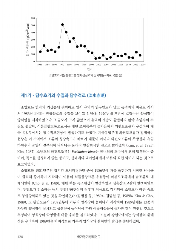 120 국가장기생태연구 제1기 담수초기의 수질과 담수적조 淡水赤潮 소양호는 한강의 최상류에 위치하고 있어 유역의 인구밀도가 낮고 농경지의 비율도 적어 서 1986년 까지는 빈영양호의 수질을 보이고 있었다. 1970년대 후반에 호림수산 양식장이 양식업을 시작하였으나 그 규모가 크지 않았으며 유역의 개발도 활발하지 않아 유입수의 수 질도 좋았다. 식물플랑크톤으로서는 매년 초여름부터 늦가을까지 와편모조류가 우점하여 계 곡 유입부에서는 담수적조현상이 발생하기도 하였다. 계곡유입부에 와편모조류가 밀집하는 현상은 이 수역에서 조류의 성장속도가 빠르기 때문이 아니라 와편모조류의 주광성과 유입 하천수의 잠입이 결부되어 나타나는 물리적 밀집현상인 것으로 밝혀졌다 Kim, et al. 1985; Kim, 1987 소양호의 와...