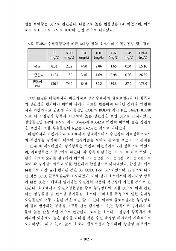 실을 보여주는 것으로 판단된다 다음으로 높은 변동성은 이었으며 이하 의 순인 것으로 나타났다 SS mg/L BOD mg/L COD mg/L TOC mg/L T-N mg/L T-P mg/L Chl-a ㎍/L 평균 8.31 2.02 4.90 2.86 1.65 0.04 15.16 표준편차 11.34 1.50 3.16 1.69 0.98 0.03 26.35 변동성 % 136.4 74.0 64.6 59.2 59.3 87.9 173.9 표 수질측정망에 따른 대강 권역 호소수의 수질변동성 평가결과 그림 은 하천에서와 마찬가지로 호소수에서의 클로로필 와 타 항목과 의 상관성을 평가하기 위하여 과거의 자료를 활용하여 나타낸 것이다 하천에 서와 마찬가지로 탄소성 유기물질인 와 가 각각 값 으로 타 수질평가 항목과 비교하여 높은...