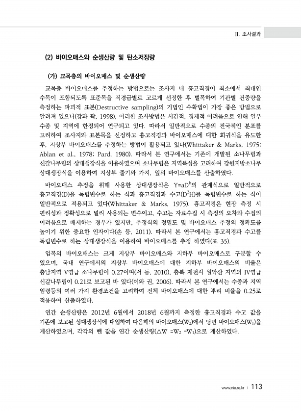 Ⅱ. 조사결과 www.nie.re.kr ? 113 2 바이오매스와 순생산량 및 탄소저장량 가 교목층의 바이오매스 및 순생산량 교목층 바이오매스를 추정하는 방법으로는 조사지 내 흉고직경이 최소에서 최대인 수목이 포함되도록 표준목을 직경급별로 고르게 선정한 후 벌목하여 기관별 건중량을 측정하는 파괴적 표본 Destructive sampling 의 기법인 수확법이 가장 좋은 방법으로 알려져 있으나 강과 곽, 1998 , 이러한 조사방법은 시간적, 경제적 어려움으로 인해 일부 수종 및 지역에 한정되어 연구되고 있다. 따라서 일반적으로 수종의 전국적인 분포를 고려하여 조사지와 표본목을 선정하고 흉고직경과 바이오매스에 대한 회귀식을 유도한 후, 지상부 바이오매스를 추정하는 방법이 활용되고 있다 Whittaker & M...