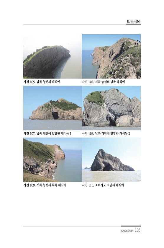 II. 조사결과 www.nie.re.kr ?105 사진 105. 남쪽 능선의 해식애 사진 106. 서쪽 능선의 남쪽 해식애 사진 107. 남쪽 해안에 발달한 해식동 1 사진 108. 남쪽 해안에 발달한 해식동 2 사진 109. 서쪽 능선의 북쪽 해식애 사진 110. 소허사도 서단의해식애