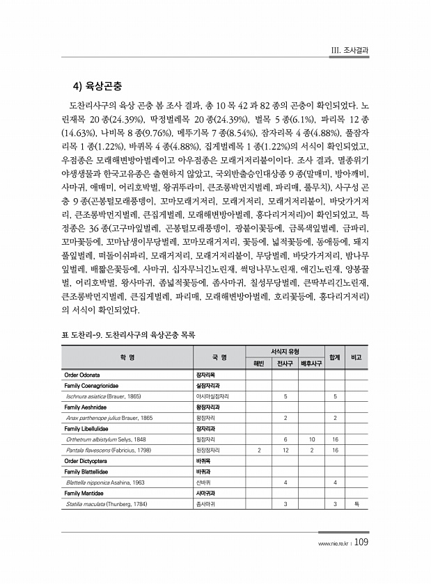 III. 조사결과 www.nie.re.kr ?109 4 도찬리사구의 육상 곤충 봄 조사 결과, 총 10 목 42 과 82 종의 곤충이 확인되었다. 노 린재목 20 종 24.39% , 딱정벌레목 20 종 24.39% , 벌목 5 종 6.1% , 파리목 12 종 14.63% , 나비목 8 종 9.76% , 메뚜기목 7 종 8.54% , 잠자리목 4 종 4.88% , 풀잠자 리목 1 종 1.22% , 바퀴목 4 종 4.88% , 집게벌레목 1 종 1.22% 의 서식이 확인되었고, 우점종은 모래해변방아벌레이고 아우점종은 모래거저리붙이이다. 조사 결과, 멸종위기 야생생물과 한국고유종은 출현하지 않았고, 국외반출승인대상종 9 종 말매미, 방아깨비, 사마귀, 애매미, 어리호박벌, 왕귀뚜라미, 큰조롱박먼지벌레, 파리매, ...
