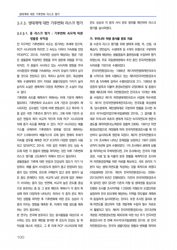 생태계에 대한 기후변화 리스크 평가 100 3.2.3. 생태계에 대한 기후변화 리스크 평가 3.2.3.1. 종 리스크 평가 기후변화 속도에 따른 생물종 부적응 전 지구적인 기후변화의 속도는 증가하는 추세에 있으며, RCP 시나리오에 따르면 그 속도는 더욱더 가속화될 전망 이다 IPCC 2014 지속적인 상승이 예상되는 평균 기온 은 생물종에 직접적인 영향을 주어 생존에 위협을 주기도 하지만, 각 종들이 서식하고 있는 서식지에 영향을 주어 서식환경의 변화를 가속화하는 서식지 유실이 더욱더 심각 할 것으로 전망되고 있다. 특히나 습지의 경우, 육상생태 계와 수생태계의 전이 지대로 생물다양성의 가치가 높아 습지의 소실은 생태계의 다양성 측면에서 큰 소실이 아닐 수 없다. 기후변화 속도를 예측하기 위해서는 미래 기...