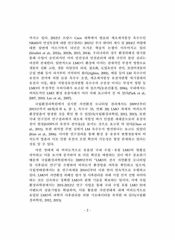 2 커지고 있다. 2012년 프랑스 Caen 대학에서 발표된 제초제저항성 옥수수인 NK603의 만성독성에 대한 연구결과는 2013년 추가 데이터 제시 및 2014년 비평에 대한 답변에 이르기까지 다년간 뜨거운 학술적 논쟁이 이루어지고 있다 S?ralini et al., 2012a, 2012b, 2013, 2014 우리나라의 경우 환경위해성 평가를 통해 수입이 승인되지만 이의 안전성과 안전관리에 대한 국민의 불안 심리는 여전히 존재한다. 일반적으로 LMO가 환경에 미치는 잠재적인 부정적 영향으로 생물의 진화 교란, 생물 다양성의 파괴, 잡초화, 도입유전자 전이, 토양미생물의 군집 변화 등이 과거부터 지적되어 왔다 Agbios, 2001 예를 들어 LM 옥수수의 유전자 전이에 의한 토종 옥수수 오염, 제초제저항...