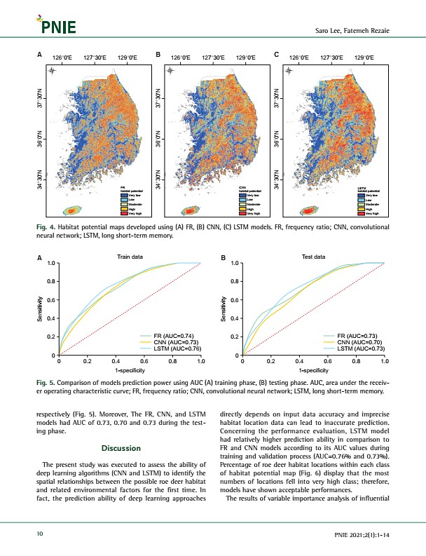 Saro Lee, Fatemeh Rezaie 10 PNIE 2021;2 1 1-14 respectively Fig. 5 Moreover, The FR, CNN, and LSTM models had AUC of 0.73, 0.70 and 0.73 during the testing phase. Discussion The present study was executed to assess the ability of deep learning algorithms CNN and LSTM to identify the spatial relationships between the possible roe deer habitat and related environmental factors for the first time. In...