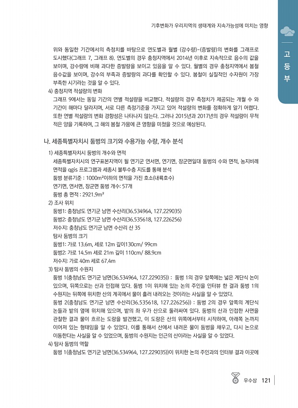 우수상 121 고 등 부 기후변화가 우리지역의 생태계와 지속가능성에 미치는 영향 위와 동일한 기간에서의 측정치를 바탕으로 연도별과 월별 강수량 증발량 의 변화를 그래프로 도시했다 그래프 7, 그래프 8 연도별의 경우 충청지역에서 2014년 이후로 지속적으로 음수의 값을 보이며, 강수량에 비해 과다한 증발량을 보이고 있음을 알 수 있다. 월별의 경우 충청지역에서 봄철 음수값을 보이며, 강수의 부족과 증발량의 과다를 확인할 수 있다. 봄철이 실질적인 수자원이 가장 부족한 시기라는 것을 알 수 있다. 4 충청지역 적설량의 변화 그래프 9에서는 동일 기간의 연별 적설량을 비교했다. 적설량의 경우 측정치가 제공되는 개월 수 와 기간이 해마다 달라지며, 서로 다른 측정기준을 가지고 있어 적설량의 변화를 정확하게 알기 ...
