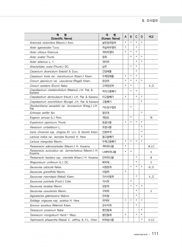 Ⅱ. 조사결과 www.nie.re.kr ? 111 학 명 Scientific Name 국 명 Korean Name A B C D 비고 Artemisia stolonifera Maxim. Kom. 넓은잎외잎쑥 * * * * Aster ageratoides Turcz. 까실쑥부쟁이 * * Aster ciliosus Kitamura 개쑥부쟁이 * * * Aster scaber Thunb. 참취 * * * Aster tataricus L. f. 개미취 * * Atractylodes ovata Thunb. DC. 삽주 * * Carpesium divaricatum Siebold & Zucc. 긴담배풀 * Carpesium triste var. manshuricum Kitam. Kitam. 두메담배풀 * * * Cir...