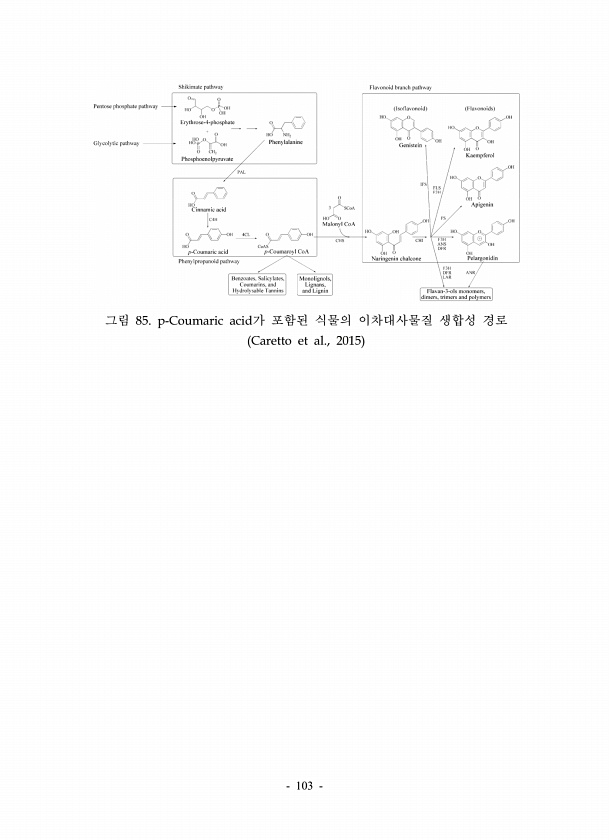 103 그림 85. p-Coumaric acid가 포함된 식물의 이차대사물질 생합성 경로 Caretto et al., 2015