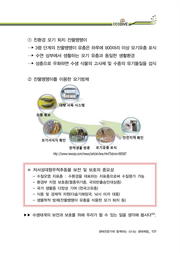 생태전문가와 함께하는 신나는 생태체험_ 121 ① 친환경 모기 퇴치 잔물땡땡이 …? 3령 단계의 잔물땡땡이 유충은 하루에 900마리 이상 모기유충 포식 …? 수면 상부에서 생활하는 모기 유충과 동일한 생활환경 …? 성충으로 우화하면 수생 식물의 고사체 및 수중의 유기물질을 섭식 ② 잔물땡땡이를 이용한 모기방제 http//www.newsje.com/news/articleView.html?idxno=66587 ※ 저서성대형무척추동물 보전 및 보호의 중요성 수질오염 지표종 수환경을 대표하는 지표종으로써 수질평가 가능 환경부 지정 보호종 멸종위기종, 국외반출승인대상종 국가 생물종 다양성 기여 한국고유종 식용 및 경제적 자원 다슬기해장국, 낚시 미끼 대용 생물학적 방제 잔물땡땡이 유충을 이용한 모기 퇴치 등 ▶▶ 수...