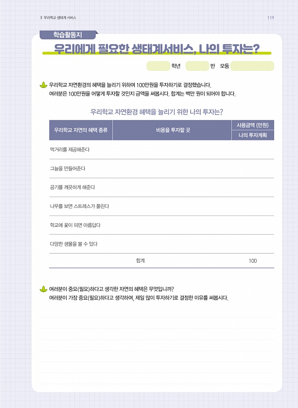 학습활동지 우리에게 필요한 생태계서비스, 나의 투자는? 학년 반 모둠 우리학교 자연환경의 혜택을 늘리기 위하여 100만원을 투자하기로 결정했습니다. 여러분은 100만원을 어떻게 투자할 것인지 금액을 써봅시다. 합계는 백만 원이 되어야 합니다. 우리학교 자연환경 혜택을 늘리기 위한 나의 투자는? 우리학교 자연의 혜택 종류 비용을 투자할 곳 사용금액 만원 나의 투자계획 먹거리를 제공해준다 그늘을 만들어준다 공기를 깨끗하게 해준다 나무를 보면 스트레스가 풀린다 학교에 꽃이 피면 아름답다 다양한 생물을 볼 수 있다 합계 100 여러분이 중요 필요 하다고 생각한 자연의 혜택은 무엇입니까? 여러분이 가장 중요 필요 하다고 생각하여, 제일 많이 투자하기로 결정한 이유를 써봅시다. Ⅱ 우리학교 생태계 서비스119
