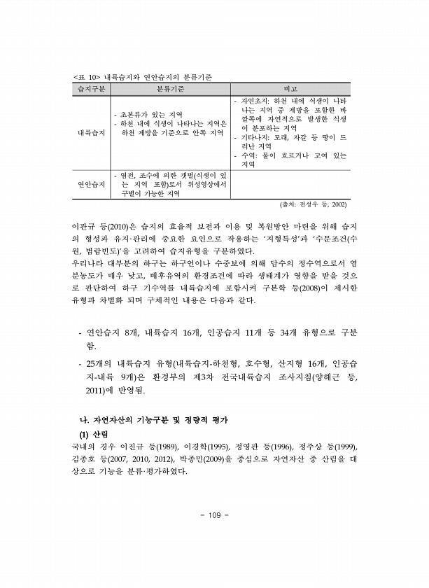 109 습지구분 분류기준 비고 내륙습지 초본류가 있는 지역 하천 내에 식생이 나타나는 지역은 하천 제방을 기준으로 안쪽 지역 자연초지 하천 내에 식생이 나타 나는 지역 중 제방을 포함한 바 깥쪽에 자연적으로 발생한 식생 이 분포하는 지역 기타나지 모래 자갈 등 땅이 드 러난 지역 수역 물이 흐르거나 고여 있는 지역 연안습지 염전 조수에 의한 갯벌 식생이 있 는 지역 포함 로서 위성영상에서 구별이 가능한 지역 출처 전성우 등 표 내륙습지와 연안습지의 분류기준 이관규 등 은 습지의 효율적 보전과 이용 및 복원방안 마련을 위해 습지 의 형성과 유지 관리에 중요한 요인으로 작용하는 지형특성 과 수문조건 수 원 범람빈도 을 고려하여 습지유형을 구분하였다 우리나라 대부분의 하구는 하구언이나 수중보에 의해 담수의 정수역...