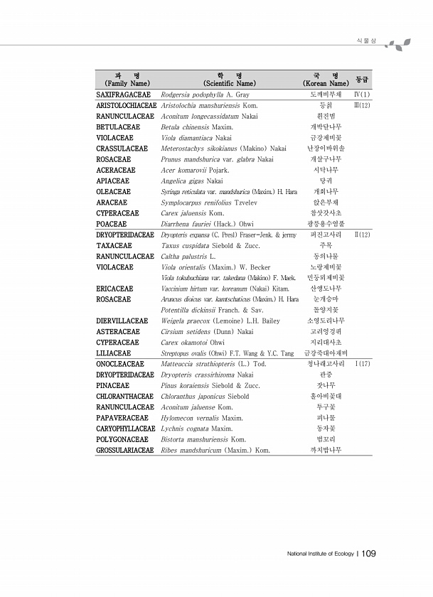 식 물 상 National Institute of EcologyⅠ109 과 명 Family Name 학 명 Scientific Name 국 명 Korean Name 등급 SAXIFRAGACEAE Rodgersia podophylla A. Gray 도깨비부채 Ⅳ 1 ARISTOLOCHIACEAE Aristolochia manshuriensis Kom. 등칡 Ⅲ 12 RANUNCULACEAE Aconitum longecassidatum Nakai 흰진범 BETULACEAE Betula chinensis Maxim. 개박달나무 VIOLACEAE Viola diamantiaca Nakai 금강제비꽃 CRASSULACEAE Meterostachys sikokianus Makino Nakai 난장이바위솔 ROSACEA...