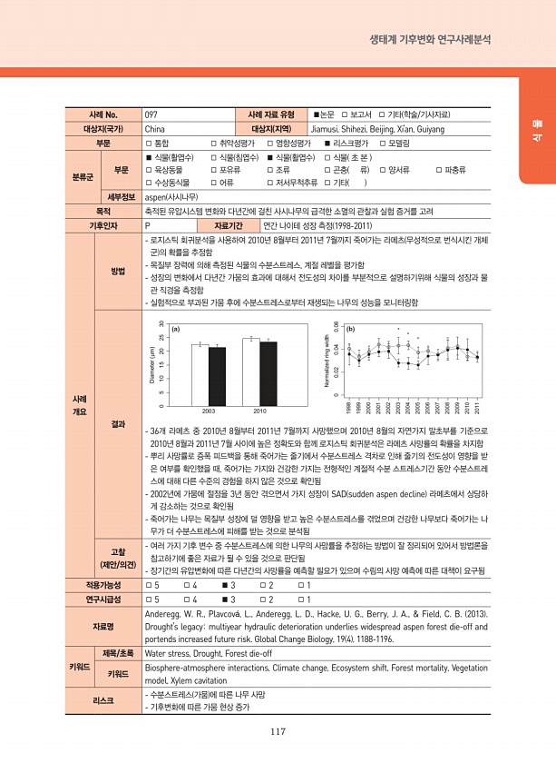 117 생태계 기후변화 연구사례분석 식 물 사례 No. 097 사례 자료 유형 ■논문 □ 보고서 □ 기타 학술/기사자료 대상지 국가 China 대상지 지역 Jiamusi, Shihezi, Beijing, Xi’an, Guiyang 부문 □ 통합 □ 취약성평가 □ 영향성평가 ■ 리스크평가 □ 모델링 분류군 부문 ■ 식물 활엽수 □ 식물 침엽수 ■ 식물 활엽수 □ 식물 초 본 □ 육상동물 □ 포유류 □ 조류 □ 곤충 류 □ 양서류 □ 파충류 □ 수상동식물 □ 어류 □ 저서무척추류 □ 기타 세부정보 aspen 사시나무 목적 축적된 유압시스템 변화와 다년간에 걸친 사시나무의 급격한 소멸의 관찰과 실험 증거를 고려 기후인자 P 자료기간 연간 나이테 성장 측정 1998-2011 사례 개요 방법 로지스틱 회귀분석을 사용...