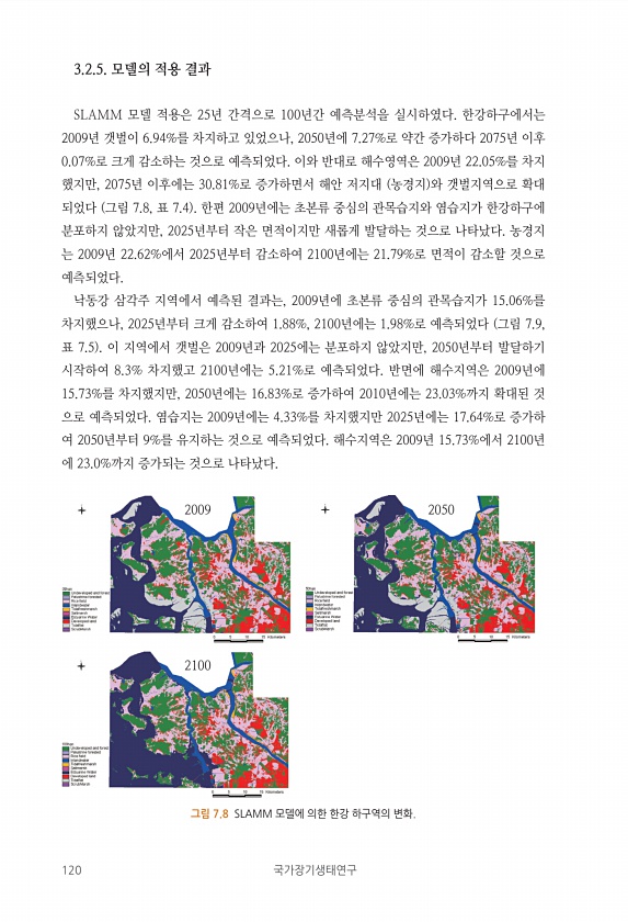 120 국가장기생태연구 3.2.5. 모델의 적용 결과 SLAMM 모델 적용은 25년 간격으로 100년간 예측분석을 실시하였다. 한강하구에서는 2009년 갯벌이 6.94%를 차지하고 있었으나, 2050년에 7.27%로 약간 증가하다 2075년 이후 0.07%로 크게 감소하는 것으로 예측되었다. 이와 반대로 해수영역은 2009년 22.05%를 차지 했지만, 2075년 이후에는 30.81%로 증가하면서 해안 저지대 농경지 와 갯벌지역으로 확대 되었다 그림 7.8, 표 7.4 한편 2009년에는 초본류 중심의 관목습지와 염습지가 한강하구에 분포하지 않았지만, 2025년부터 작은 면적이지만 새롭게 발달하는 것으로 나타났다. 농경지 는 2009년 22.62%에서 2025년부터 감소하여 2100년에는 21.79%로 면적...