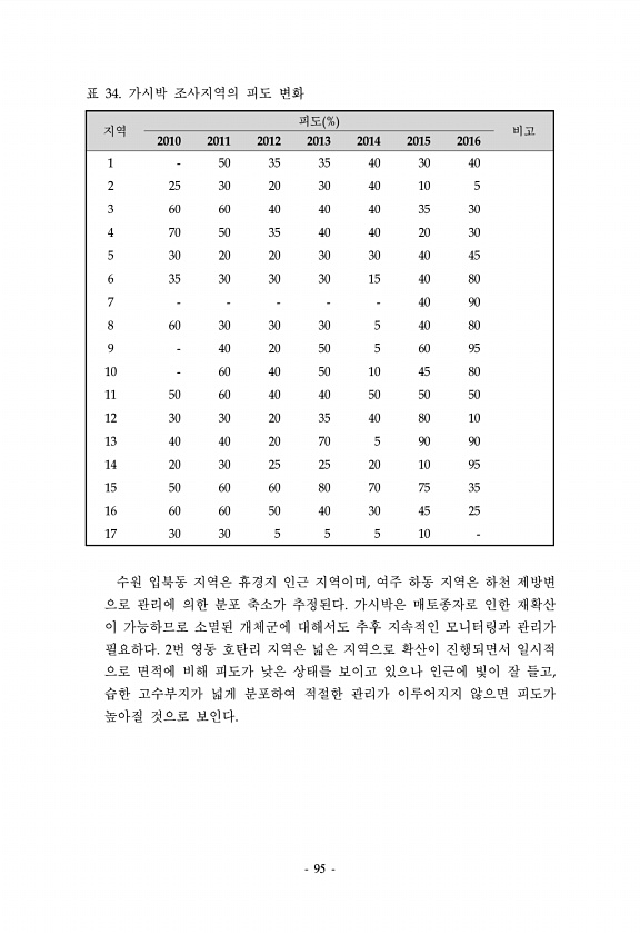 95 지역 피도 % 비고 2010 2011 2012 2013 2014 2015 2016 1 50 35 35 40 30 40 2 25 30 20 30 40 10 5 3 60 60 40 40 40 35 30 4 70 50 35 40 40 20 30 5 30 20 20 30 30 40 45 6 35 30 30 30 15 40 80 7 40 90 8 60 30 30 30 5 40 80 9 40 20 50 5 60 95 10 60 40 50 10 45 80 11 50 60 40 40 50 50 50 12 30 30 20 35 40 80 10 13 40 40 20 70 5 90 90 14 20 30 25 25 20 10 95 15 50 60 60 80 70 75 35 16 60 60 50 40 30 45 25 17 3...