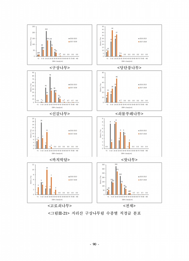 90 구상나무 당단풍나무 신갈나무 쇠물푸레나무 까치박달 잣나무 고로쇠나무 전체 그림Ⅲ-21 지리산 구상나무림 수종별 직경급분포