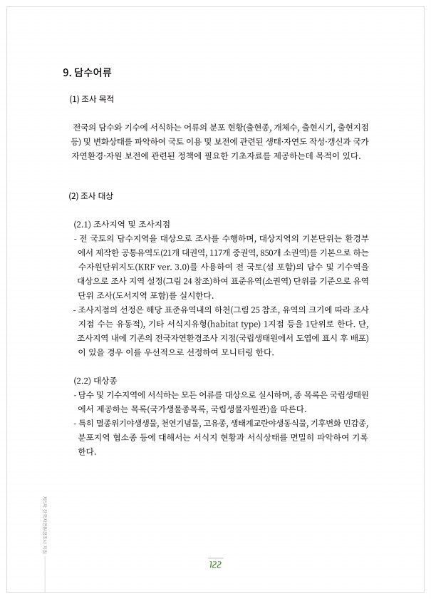 122 제5차 전국자연환경조사 지침 9. 담수어류 1 조사?목적 전국의?담수와?기수에?서식하는?어류의?분포?현황 출현종, 개체수, 출현시기, 출현지점 등 및?변화상태를?파악하여?국토?이용?및?보전에?관련된?생태·자연도?작성·갱신과?국가 자연환경·자원?보전에?관련된?정책에?필요한?기초자료를?제공하는데?목적이?있다. 2 조사?대상 ?.? 조사지역?및?조사지점 전?국토의?담수지역을?대상으로?조사를?수행하며, 대상지역의?기본단위는?환경부 에서?제작한?공통유역도 ??개?대권역, ???개?중권역, ???개?소권역 를?기본으로?하는 수자원단위지도 KRF ver. ?.? 를?사용하여?전?국토 섬?포함 의?담수?및?기수역을 대상으로?조사?지역?설정 그림 ?? 참조 하여?표준유역 소권역 단위를?기준으로?유역 단위?조사 도서지...