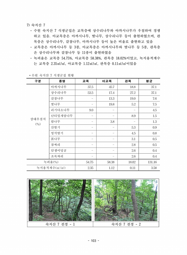 103 7 숙지산 7 수원 숙지산 7 식생군집은 교목층에 상수리나무와 아까시나무가 우점하여 경쟁 하고 있음. 아교목층은 아까시나무, 벚나무, 상수리나무 등이 출현하였으며, 관 목층은 상수리나무, 갈참나무, 아까시나무 등이 높은 비율로 출현하고 있음 교목층은 아까시나무 등 3종, 아교목층은 아까시나무와 벚나무 등 5종, 관목층 은 상수리나무와 갈참나무 등 11종이 출현하였음 녹피율은 교목층 54.75%, 아교목층 58.38%, 관목층 18.02%이었고, 녹지용적계수 는 교목층 2.35㎥/㎡, 아교목층 1.12㎥/㎡, 관목층 0.11㎥/㎡이었음 ?수원 숙지산 7 식생군집 현황 구분 종명 교목 아교목 관목 평균 상대우점치 % 아까시나무 37.5 45.7 18.8 37.1 상수리나무 53.5 17.4 27.2 37...