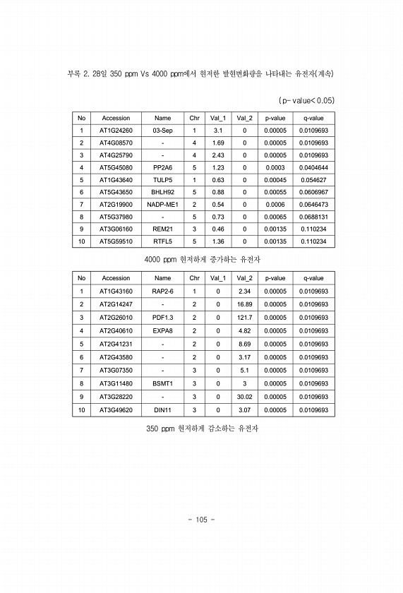 105 부록 2. 28일 350 ppm Vs 4000 ppm에서 현저한 발현변화량을 나타내는 유전자 계속 p- value 0.05 No Accession Name Chr Val_1 Val_2 p-value q-value 1 AT1G24260 03-Sep 1 3.1 0 0.00005 0.0109693 2 AT4G08570 4 1.69 0 0.00005 0.0109693 3 AT4G25790 4 2.43 0 0.00005 0.0109693 4 AT5G45080 PP2A6 5 1.23 0 0.0003 0.0404644 5 AT1G43640 TULP5 1 0.63 0 0.00045 0.054627 6 AT5G43650 BHLH92 5 0.88 0 0.00055 0.0606967 7 AT2G19900 NADP-ME1...