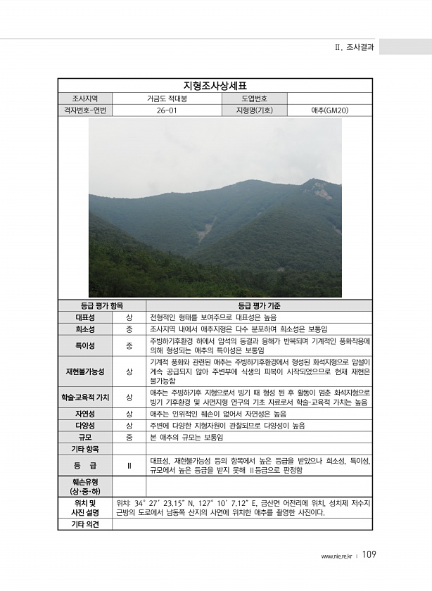 Ⅱ. 조사결과 www.nie.re.kr ? 109 지형조사상세표 조사지역 거금도 적대봉 도엽번호 격자번호-연번 26-01 지형명 기호 애추 GM20 등급 평가 항목 등급 평가 기준 대표성 상 전형적인 형태를 보여주므로 대표성은 높음 희소성 중 조사지역 내에서 애추지형은 다수 분포하여 희소성은 보통임 특이성 중 주빙하기후환경 하에서 암석의 동결과 융해가 반복되며 기계적인 풍화작용에 의해 형성되는 애추의 특이성은 보통임 재현불가능성 상 기계적 풍화와 관련된 애추는 주빙하기후환경에서 형성된 화석지형으로 암설이 계속 공급되지 않아 주변부에 식생의 피복이 시작되었으므로 현재 재현은 불가능함 학술?교육적 가치 상 애추는 주빙하기후 지형으로서 빙기 때 형성 된 후 활동이 멈춘 화석지형으로 빙기 기후환경 및 사면지형 연구...