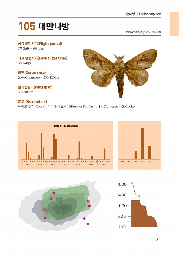 121 솔나방과 Lasiocampidae 성충 출현시기 Flight period 7월 Jul 9월 Sep 최고 출현시기 Peak fight time 8월 Aug 출현 Occurrence 보통 Common 200-1200m 날개편길이 Wingspan 60 90mm 분포 Distribution 한반도 전역 Korea , 러시아 극동지역 Russian Far East , 대만 Taiwan , 인도 India Paralebeda plagifera Walker M J J A S O M J J A S O M J J A S O M J J A S O M J J A S O M J J A S O M J J A S O May Jun Jul Aug Sep Oct 2009 2010 2011 2012 2013 2014 2015 To...