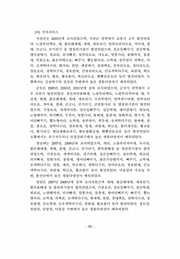 99 다 지지서비스 서천군은 2010년에 조사되었으며, 서천군 전역에서 조류가 고루 발견되었 다. 노랑부리백로, 매, 붉은배새매, 새매, 새호리기, 알락꼬리마도요, 저어새, 참 매, 큰고니, 큰기러기 등 멸종위기종이 발견되었으며, 검은등뻐꾸기, 검은딱새, 괭이갈매기, 꾀꼬리, 되지빠귀, 뒷부리도요, 마도요, 말똥가리, 물때까치, 물총 새, 민물도요, 붉은어깨도요, 뻐꾸기, 뿔논병아리, 소쩍새, 솔부엉이 쇠백로, 아 비, 오색딱다구리, 왜가리, 원앙, 재갈매기, 중대백로, 중부리도요, 청다리도요, 청둥오리, 청딱다구리, 청호반새, 큰뒷부리도요, 큰오색딱다구리, 파랑새, 학도 요, 해오라기, 황로, 황조롱이, 흑꼬리도요, 흰빰검둥오리 등이 발견되었다. 모 형에서는 금강하구와 길상천 주변에서 높은 생물다양성이 예...