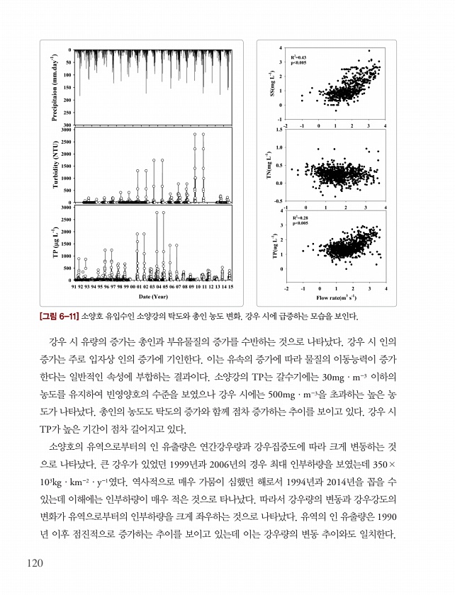 120 [그림 6-11] 소양호 유입수인 소양강의 탁도와 총인 농도 변화. 강우 시에 급증하는 모습을 보인다. 강우 시 유량의 증가는 총인과 부유물질의 증가를 수반하는 것으로 나타났다. 강우 시 인의 증가는 주로 입자상 인의 증가에 기인한다. 이는 유속의 증가에 따라 물질의 이동능력이 증가 한다는 일반적인 속성에 부합하는 결과이다. 소양강의 TP는 갈수기에는 30mg·m-3 이하의 농도를 유지하여 빈영양호의 수준을 보였으나 강우 시에는 500mg·m-3을 초과하는 높은 농 도가 나타났다. 총인의 농도도 탁도의 증가와 함께 점차 증가하는 추이를 보이고 있다. 강우 시 TP가 높은 기간이 점차 길어지고 있다. 소양호의 유역으로부터의 인 유출량은 연간강우량과 강우집중도에 따라 크게 변동하는 것 으로 나타났다. 큰...