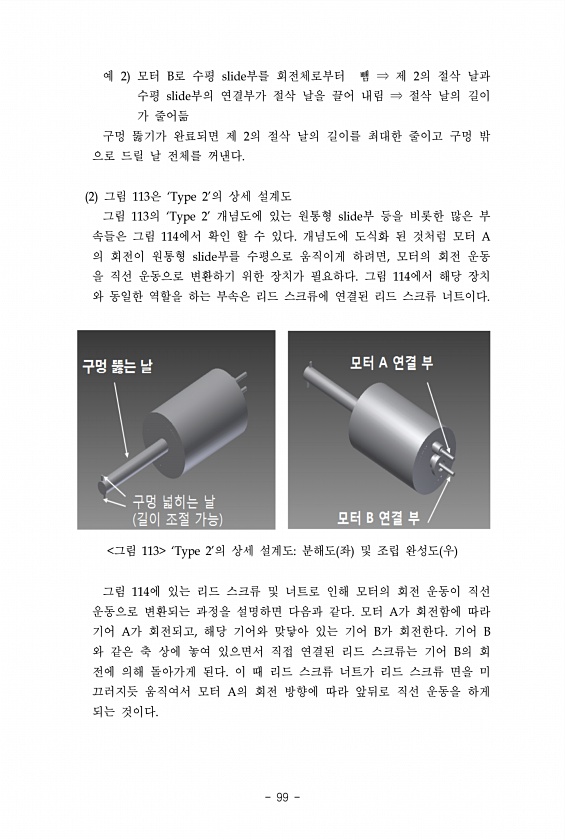 99 예 2 모터 B로 수평 slide부를 회전체로부터 뺌 ⇒ 제 2의 절삭 날과 수평 slide부의 연결부가 절삭 날을 끌어 내림 ⇒ 절삭 날의 길이 가 줄어듦 구멍 뚫기가 완료되면 제 2의 절삭 날의 길이를 최대한 줄이고 구멍 밖 으로 드릴 날 전체를 꺼낸다. 2 그림 113은 ‘Type 2’의 상세 설계도 그림 113의 ‘Type 2’ 개념도에 있는 원통형 slide부 등을 비롯한 많은 부 속들은 그림 114에서 확인 할 수 있다. 개념도에 도식화 된 것처럼 모터 A 의 회전이 원통형 slide부를 수평으로 움직이게 하려면, 모터의 회전 운동 을 직선 운동으로 변환하기 위한 장치가 필요하다. 그림 114에서 해당 장치 와 동일한 역할을 하는 부속은 리드 스크류에 연결된 리드 스크류 너트이다. 그림 11...