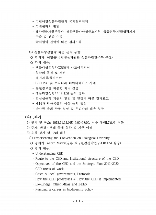 111 국립해양생물자원관의 국제협력체제 국제협력의 방법 ·해양생물자원부국과 해양생물다양성중요지역 공동연구거점/협력체제 구축 및 전략 수립 국제협력 전략에 따른 결과도출 아 생물다양성협약 최근 논의 동향 ? 강의자이병윤 국립생물자원관 생물자원연구부 부장 ? 강의 내용생물다양성협약 CBD 과 나고야의정서 ·협약의 목적 및 경과 유전자원/물질이란 ·CBD 2조 및 우리나라 데이터베이스 사례 유전정보를 이용한 이익 창출 생물다양성협약 내 DSI 논의 경과 ·합성생물학 기술의 발전 및 일정에 따른 경과보고 제14차 당사국총회 예상 논의 쟁점 ·당사국 총회 상황 설명 및 우리나라 대응 입장 다 3차시 1 일시 및 장소2018.11.12. 월 9001800, 서울 롯데L7호텔 명동 2 주제환경·생태 국제 협약 및 기구 ...