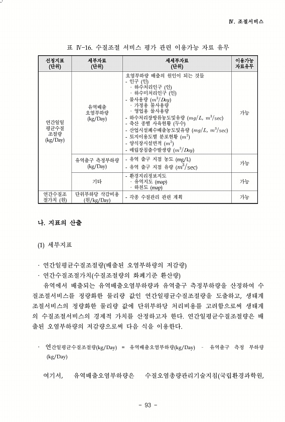 Ⅳ. 조절서비스 93 선정지표 단위 세부자료 단위 세세부자료 단위 이용가능 자료유무 연간일일 평균수질 조절량 kg/Day 유역배출 오염부하량 kg/Day 오염부하량 배출의 원인이 되는 것들 인구 인 · 하수처리인구 인 · 하수미처리인구 인 물사용량 ??? · 가정용 물사용량 · 영업용 물사용량 하수처리장방류농도및유량 ??, ?sec 축산 종별 사육현황 두수 산업시설폐수배출농도및유량 ??, ?sec 토지이용도별 분포현황 ? 양식장시설면적 ? 매립장침출수발생량 ??? 가능 유역출구 측정부하량 kg/Day 유역 출구 지점 농도 mg/L 유역 출구 지점 유량 ?sec 가능 기타 환경지리정보지도 · 유역지도 map · 하천도 map 가능 연간수질조 절가치 원 단위부하당 삭감비용 원/k...