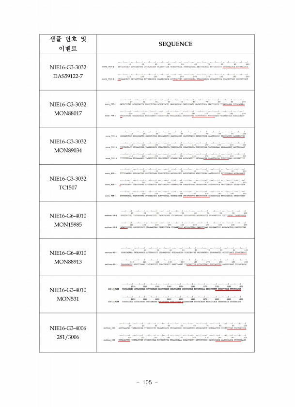 샘플 번호 및 이벤트 SEQUENCE NIE16-G3-3032 DAS59122-7 NIE16-G3-3032 MON88017 NIE16-G3-3032 MON89034 NIE16-G3-3032 TC1507 NIE16-G6-4010 MON15985 NIE16-G6-4010 MON88913 NIE16-G3-4010 MON531 NIE16-G3-4006281/3006