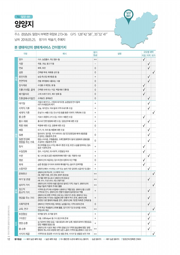 No. 밀양- 본 생태자산의 생태계서비스 간이평가지 구분 예시 평가 등급 설명 규모별 혜택 지점 지역 국가 공급 담수 식수, 농업용수, 축산 용수 등 ++ √ 식량 곡물, 과실, 물고기 등 √ 연료 화목, 토탄 0 √ 섬유 건축용 목재, 의류용 섬유 등 0 √ 유전자원 농업·축산업 희귀품종 등 + √ 천연약재 전통 의약품에 사용되는 식물 0 √ 장식재료 수집용 조개껍질, 꽃 등 0 √ 진흙,미네랄, 골재 건축용 모래 또는 자갈, 벽돌재료 진흙 등 0 √ 폐기물처리 고체 쓰레기 하치, 폐수 방류 등 0 √ 친환경에너지발전 조력발전, 풍력발전 0 √ 조절 대기질 자동차 배기가스, 산업체 대기오염, 농업발생 먼지 등의 대기 미세물질의 제거 + √ 지역적 기후 그늘, 대기온도 저하 등의 지역 미세기후 조절 + √ ...
