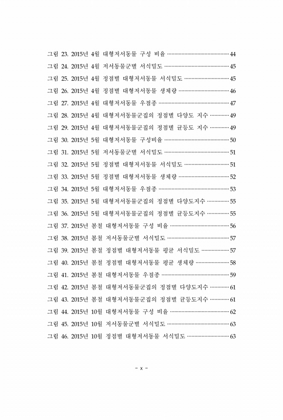 x 그림 23. 2015년 4월 대형저서동물 구성 비율 ··········································· 44 그림 24. 2015년 4월 저서동물군별 서식밀도 ············································· 45 그림 25. 2015년 4월 정점별 대형저서동물 서식밀도 ······························· 45 그림 26. 2015년 4월 정점별 대형저서동물 생체량 ··································· 46 그림 27. 2015년 4월 대형저서동물 우점종 ················································· 47 그림 28. 2015년 4월 대형저서동물군집의 정점...