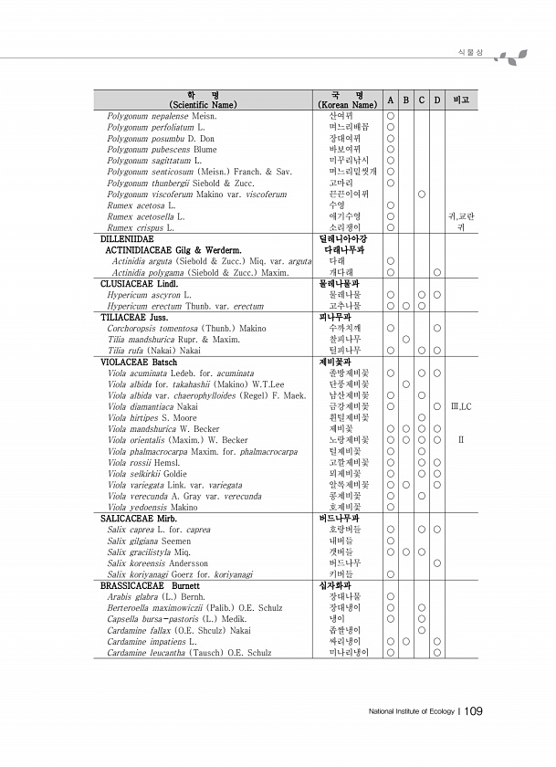 식 물 상 National Institute of EcologyⅠ109 학 명 Scientific Name 국 명 Korean Name A B C D 비고 Polygonum nepalense Meisn. 산여뀌 ○ Polygonum perfoliatum L. 며느리배꼽 ○ Polygonum posumbu D. Don 장대여뀌 ○ Polygonum pubescens Blume 바보여뀌 ○ Polygonum sagittatum L. 미꾸리낚시 ○ Polygonum senticosum Meisn. Franch. & Sav. 며느리밑씻개 ○ Polygonum thunbergii Siebold & Zucc. 고마리 ○ Polygonum viscoferum Makino var. viscoferum 끈끈이여뀌 ○ Rum...