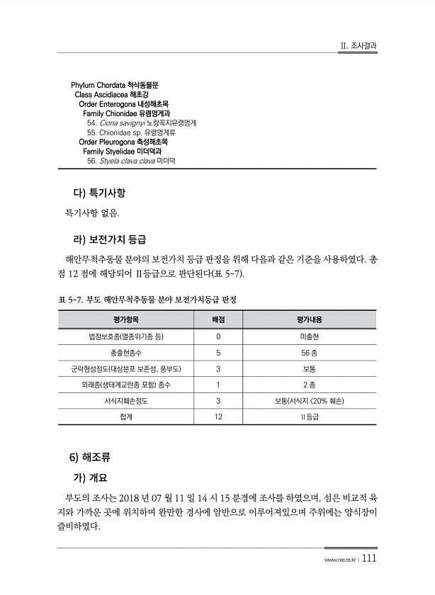 II. 조사결과 www.nie.re.kr ?111 특기사항 없음. 해안무척추동물 분야의 보전가치 등급 판정을 위해 다음과 같은 기준을 사용하였다. 총 점 12 점에 해당되어 Ⅱ등급으로 판단된다 표 5-7 평가항목 배점 평가내용 법정보호종 멸종위기종 등 0 미출현 총출현종수 5 56 종 군락형성정도 대상분포 보존성, 풍부도 3 보통 외래종 생태계교란종 포함 종수 1 2 종 서식지훼손정도 3 보통 서식지 20% 훼손 합계 12 Ⅱ등급 표 5-7. 부도 해안무척추동물 분야 보전가치등급 판정 6 부도의 조사는 2018 년 07 월 11 일 14 시 15 분경에 조사를 하였으며, 섬은 비교적 육 지와 가까운 곳에 위치하며 완만한 경사에 암반으로 이루어져있으며 주위에는 양식장이 즐비하였다. Phylum Chordata...