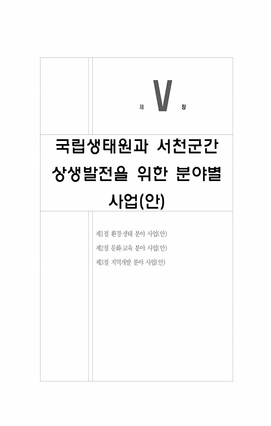 제Ⅴ 장 국립생태원과 서천군간 상생발전을 위한 분야별 사업 안 제1절 환경·생태 분야 사업 안 제2절 문화·교육 분야 사업 안 제3절 지역개발 분야 사업 안