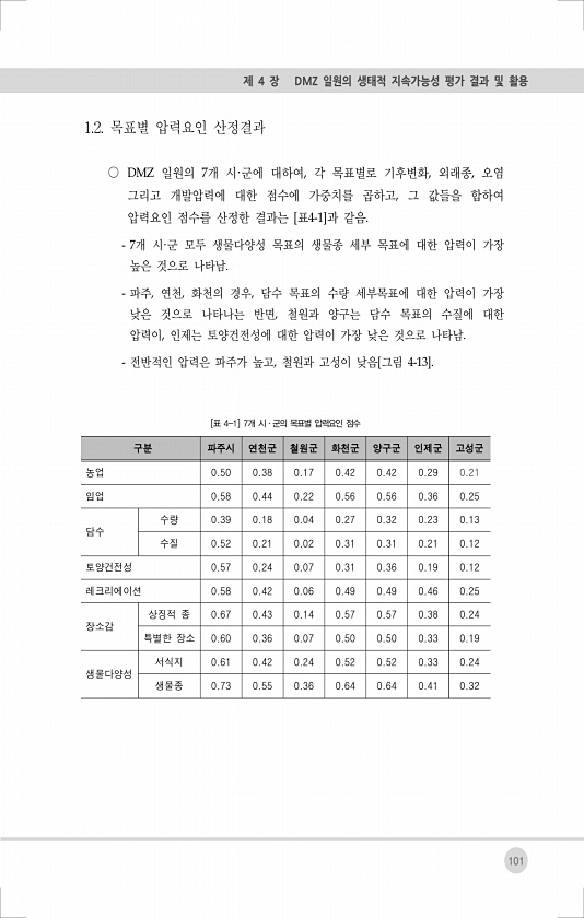 101 제 4 장 DMZ 일원의 생태적 지속가능성 평가 결과 및 활용 1.2. 목표별 압력요인 산정결과 ○ DMZ 일원의 7개 시·군에 대하여, 각 목표별로 기후변화, 외래종, 오염 그리고 개발압력에 대한 점수에 가중치를 곱하고, 그 값들을 합하여 압력요인 점수를 산정한 결과는 [표4-1]과 같음. 7개 시·군 모두 생물다양성 목표의 생물종 세부 목표에 대한 압력이 가장 높은 것으로 나타남. 파주, 연천, 화천의 경우, 담수 목표의 수량 세부목표에 대한 압력이 가장 낮은 것으로 나타나는 반면, 철원과 양구는 담수 목표의 수질에 대한 압력이, 인제는 토양건전성에 대한 압력이 가장 낮은 것으로 나타남. 전반적인 압력은 파주가 높고, 철원과 고성이 낮음[그림 4-13]. 구분 파주시 연천군 철원군 화천군 양구군 ...