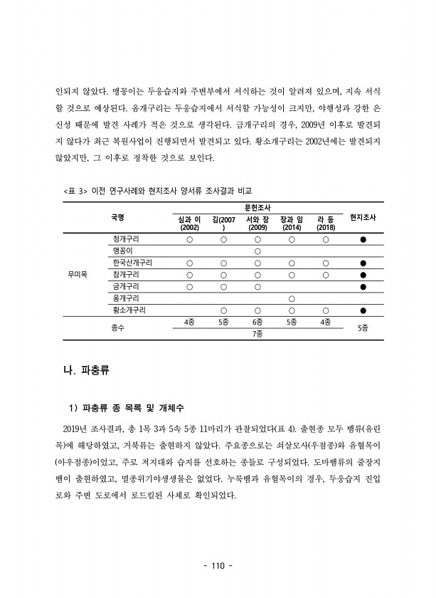 110 인되지 않았다. 맹꽁이는 두웅습지와 주변부에서 서식하는 것이 알려져 있으며, 지속 서식 할 것으로 예상된다. 옴개구리는 두웅습지에서 서식할 가능성이 크지만, 야행성과 강한 은 신성 때문에 발견 사례가 적은 것으로 생각된다. 금개구리의 경우, 2009년 이후로 발견되 지 않다가 최근 복원사업이 진행되면서 발견되고 있다. 황소개구리는 2002년에는 발견되지 않았지만, 그 이후로 정착한 것으로 보인다. 국명 문헌조사 심과 이 현지조사 2002 김 2007 서와 장 2009 장과 임 2014 라 등 2018 무미목 청개구리 ○ ○ ○ ○ ○ ● 맹꽁이 ○ 한국산개구리 ○ ○ ○ ○ ○ ● 참개구리 ○ ○ ○ ○ ○ ● 금개구리 ○ ○ ○ ● 옴개구리 ○ 황소개구리 ○ ○ ○ ○ ● 종수 4종 5종 6종 5종...