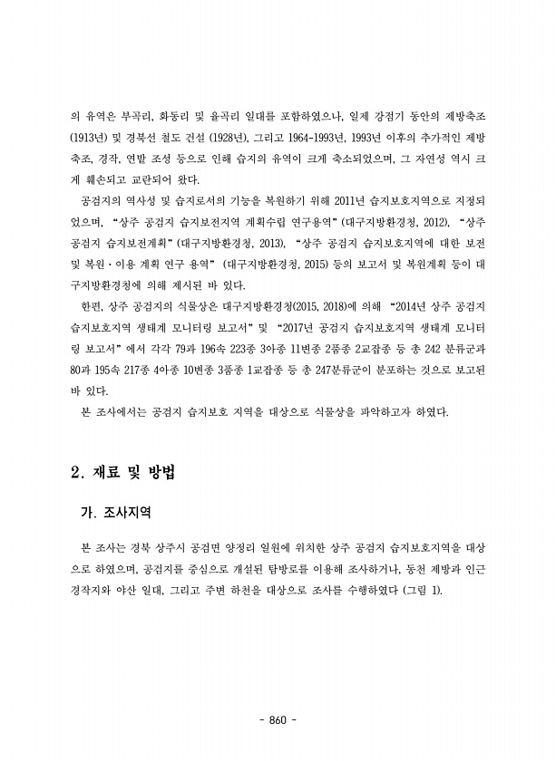 860 의 유역은 부곡리, 화동리 및 율곡리 일대를 포함하였으나, 일제 강점기 동안의 제방축조 1913년 및 경북선 철도 건설 1928년 , 그리고 1964-1993년, 1993년 이후의 추가적인 제방 축조, 경작, 연밭 조성 등으로 인해 습지의 유역이 크게 축소되었으며, 그 자연성 역시 크 게 훼손되고 교란되어 왔다. 공검지의 역사성 및 습지로서의 기능을 복원하기 위해 2011년 습지보호지역으로 지정되 었으며, “상주 공검지 습지보전지역 계획수립 연구용역” 대구지방환경청, 2012 , “상주 공검지 습지보전계획” 대구지방환경청, 2013 , “상주 공검지 습지보호지역에 대한 보전 및 복원·이용 계획 연구 용역” 대구지방환경청, 2015 등의 보고서 및 복원계획 등이 대 구지방환경청에 의해 제시된 바 있다....