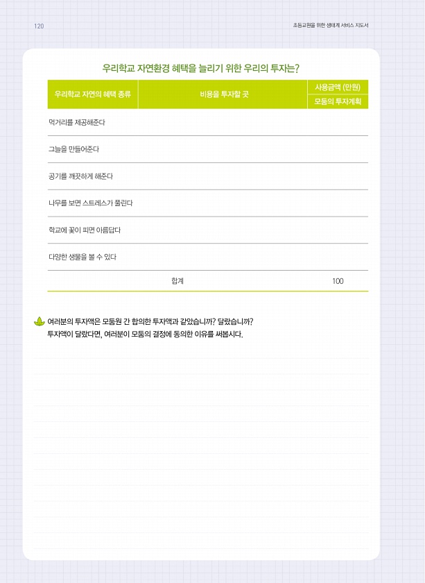우리학교 자연환경 혜택을 늘리기 위한 우리의 투자는? 우리학교 자연의 혜택 종류 비용을 투자할 곳 사용금액 만원 모둠의 투자계획 먹거리를 제공해준다 그늘을 만들어준다 공기를 깨끗하게 해준다 나무를 보면 스트레스가 풀린다 학교에 꽃이 피면 아름답다 다양한 생물을 볼 수 있다 합계 100 여러분의 투자액은 모둠원 간 합의한 투자액과 같았습니까? 달랐습니까? 투자액이 달랐다면, 여러분이 모둠의 결정에 동의한 이유를 써봅시다. 120 초등교원을 위한 생태계 서비스지도서